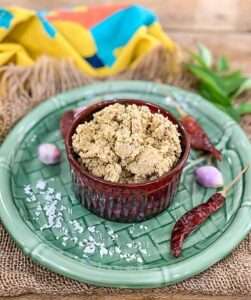 Take all the above ingredients in a blender or small mixie jar.Pulse and grind it to a coarse paste without adding any water. You may have to mix it once or twice in between the grinding process. The moisture from the onion and coconut will be sufficient for grinding.Adjust the ingredients to your taste. Usually it is made spicy, with tamarind to add the right amount of sourness and enough salt to balance everything.VariationA variation of this is also made in Tamil Nadu known as Thengai Thogayal and in Andhra known as Kobbari Pachadi. In Thengai Thogayal, 2 tbsp of urad dal is roasted in 1 tbsp of oil along with the dry red chilies. It is then ground coarsely with grated coconut, tamarind, curry leaves, and asafoetida. No onion or garlic is used here. For Kobbari Pachadi, 1 tbsp of channa dal and 1 tbsp of urad dal are roasted and ground along with grated coconut, dry red chilies, asafoetida and tamarind. I have tried all the variations and it all tastes good.